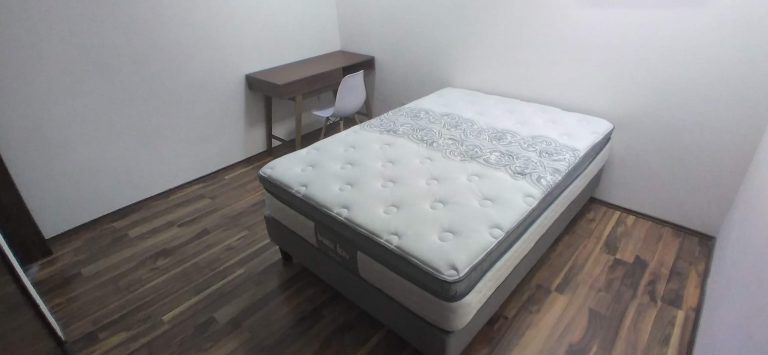 Habitaciones individuales parcialmente amuebladas para estudiantes y profesionales con camas king, queen, matrimonial e individual, armario y escritorio. Incluyen acceso a cocina equipada, internet ultrarrápido, servicios de gas y electricidad, y mantenimiento mensual. Contrato flexible de 2 a 6 meses, renovable o cancelable después del segundo mes.